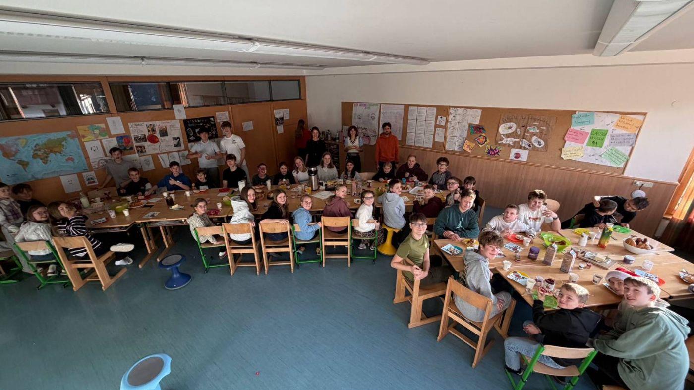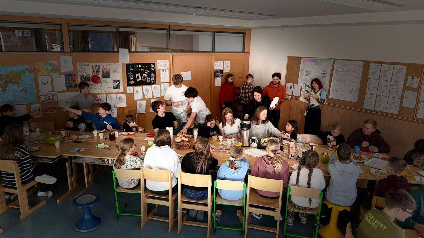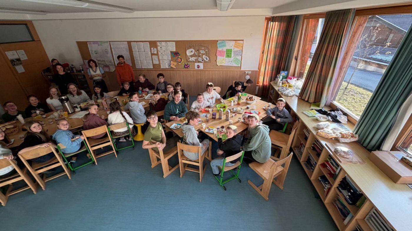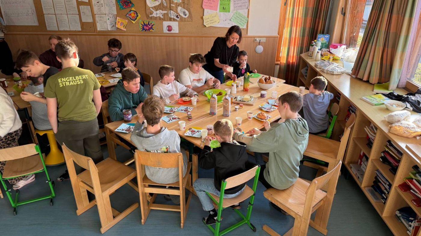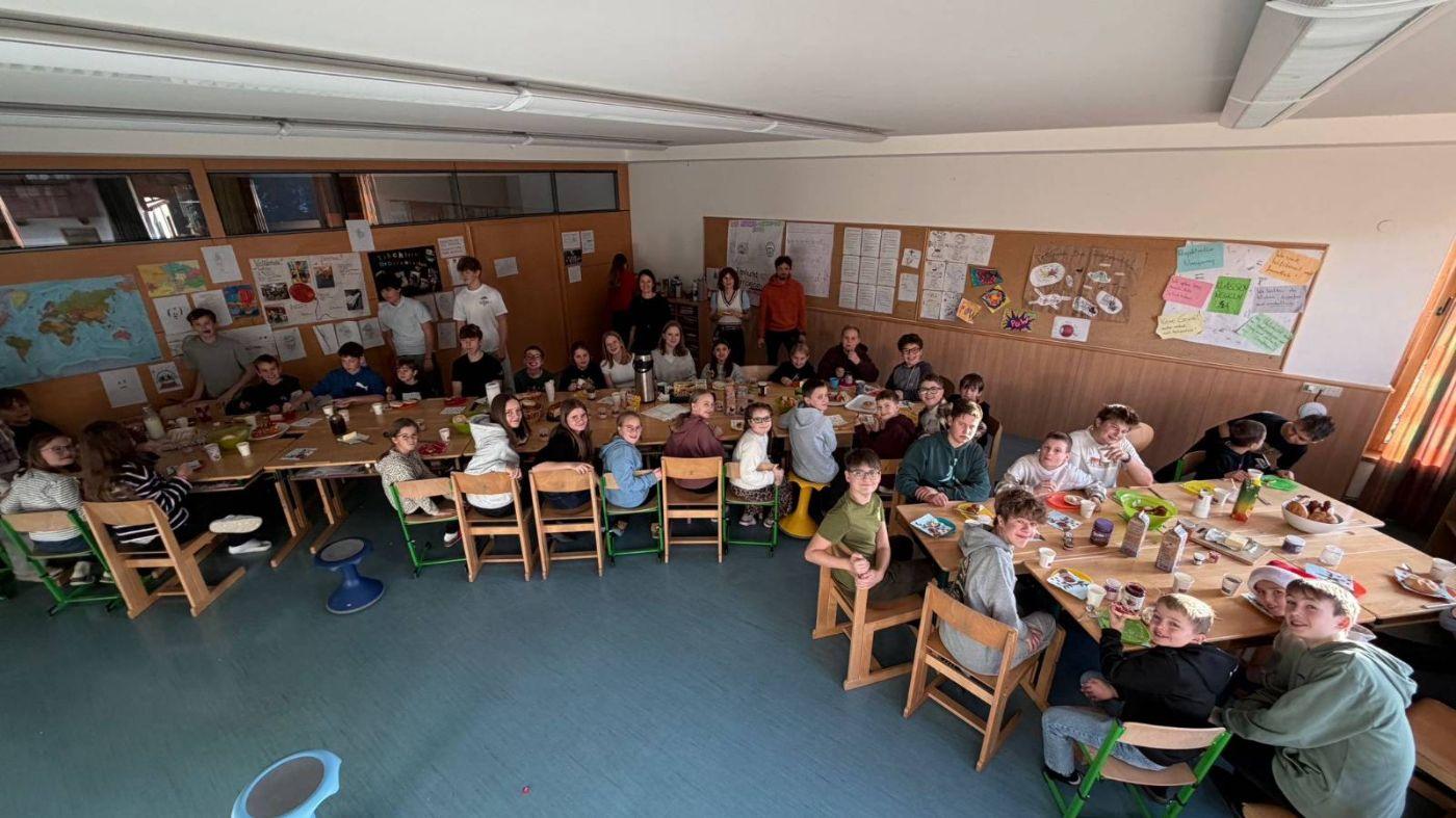 Nach unserer stimmungsvollen Weihnachtsandacht wurde es in der Schule noch einmal richtig gemütlich. Gemeinsam mit unseren Buddys kamen die beiden 4. Klassen der VS und MS zu einem liebevoll vorbereiteten Frühstück zusammen. Bei frischen Brötchen, Obst und vielen Leckereien blieb Zeit für Gespräche, Lachen und ein fröhliches Miteinander. Im Anschluss sorgten verschiedene Gesellschaftsspiele für viel Spaß und gute Laune. Ob Karten-, Würfel- oder Brettspiele – überall wurde gespielt, angefeuert und gemeinsam gelacht. Die Zeit verging wie im Flug und schuf viele schöne Momente. So war dieser besondere Vormittag eine gelungene Einstimmung auf die Weihnachtsferien und zeigte einmal mehr, wie wertvoll Gemeinschaft, Zusammenhalt und Freude im Schulalltag sind.